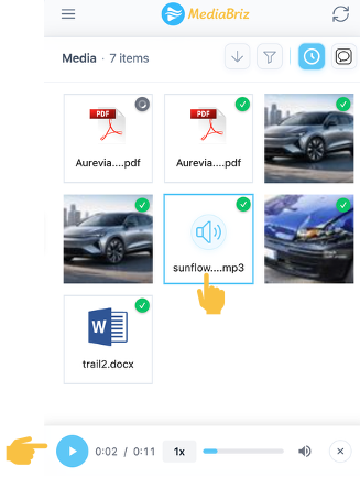 Clicking an audio media item opens an audio player bar at the bottom of the application screen and starts playback.